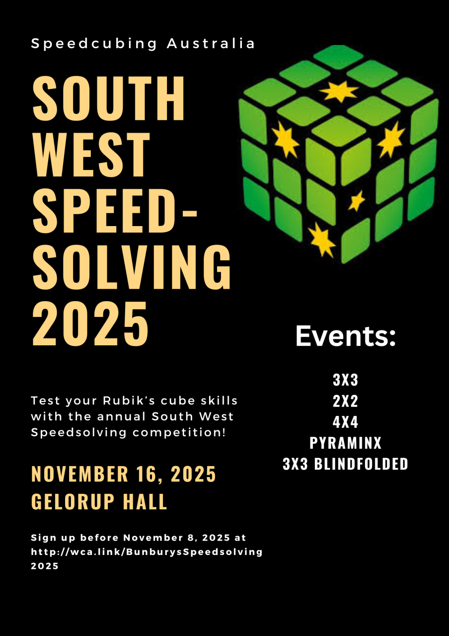 Get ready to twist, turn, and race your way to glory at South West Speedsolving 2025, an official WCA‑sanctioned competition where precision meets adrenaline. Hosted by Speedcubing Australia, just like dozens of other events across the country, this one’s volunteer-run for the love of the cube.