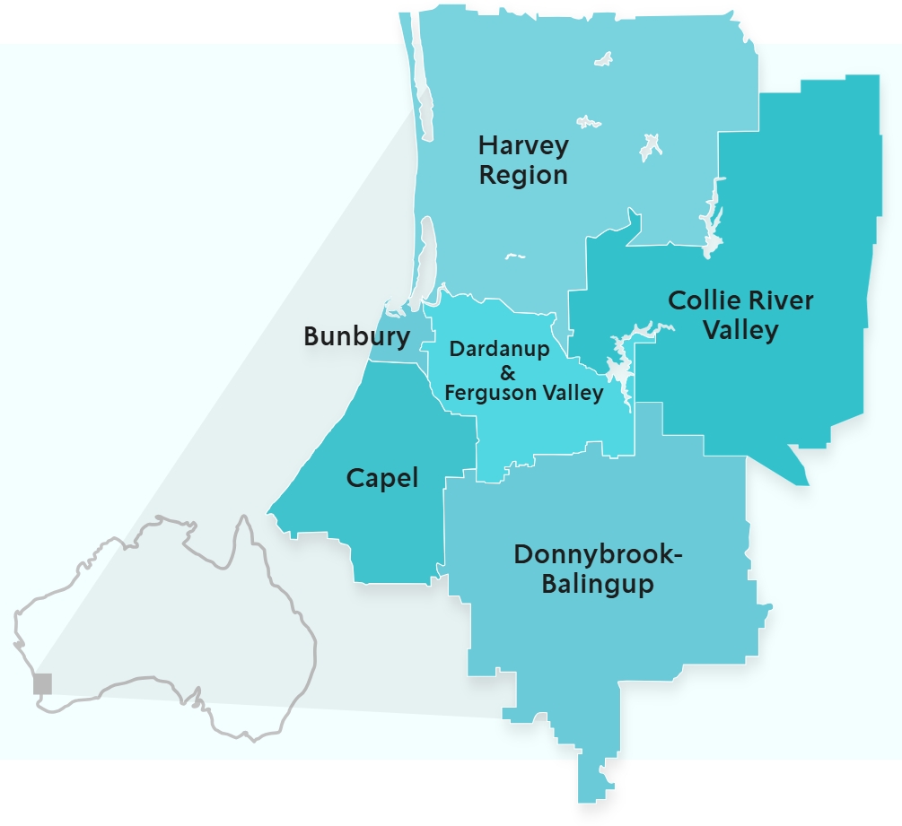 Bunbury Geographe, in Australia’s South West, is a region of striking contrasts and rich experiences. It encompasses the vibrant seaside port city of Bunbury, the lush farmland and fresh produce of the Harvey Region, the sweeping views and immersive food and wine experiences of Dardanup’s Ferguson Valley, and the heart-pumping tracks and trails of the Collie River Valley.
